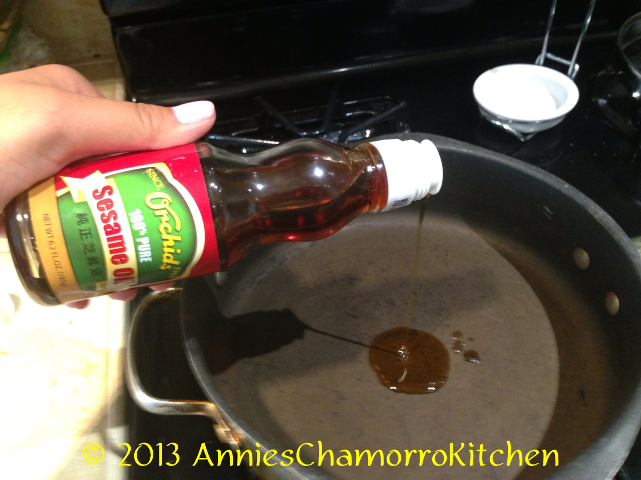 2.  Place 2 tablespoons sesame oil into a large skillet.  Add the contents of the ziplock bag — the meat and marinade together.  Cook over medium high heat until the meat is done and the sauce has thickened.