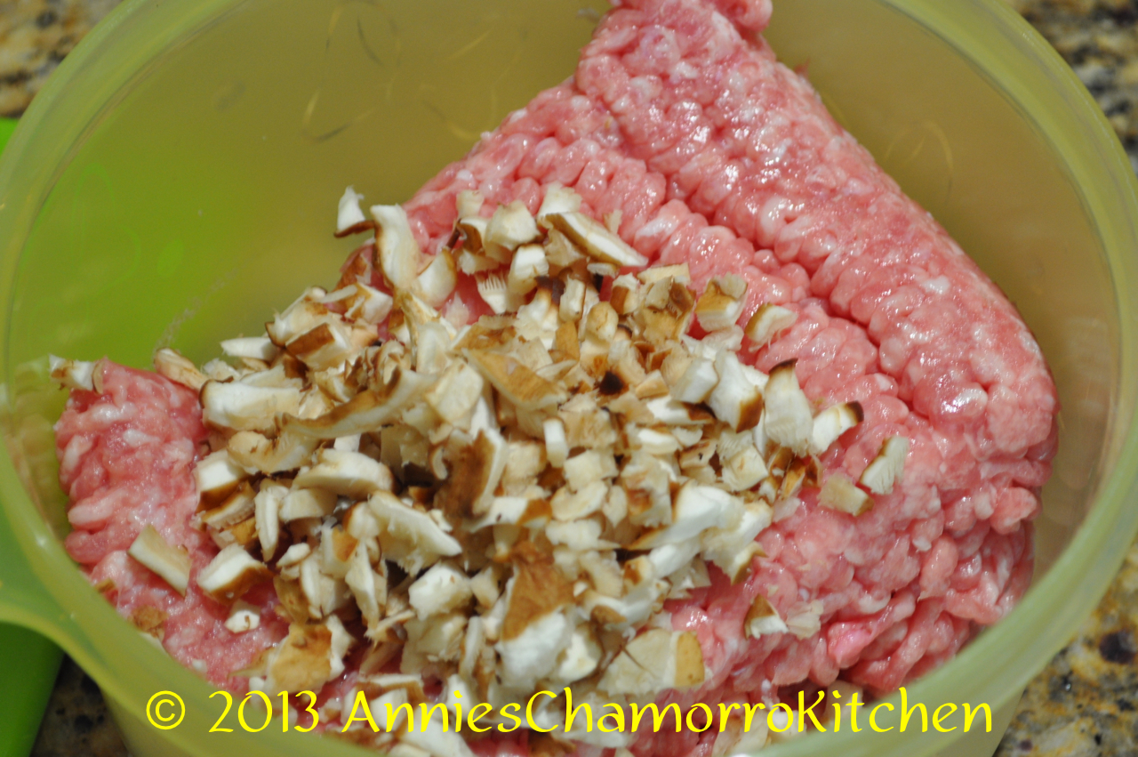 2.  Wipe any dirt off the mushrooms using a damp paper towel.  *Do not rinse fresh mushrooms.  (If using dried shiitake mushrooms, soak in hot water until soft.)  Slice/dice the mushrooms then add to the mixing bowl.