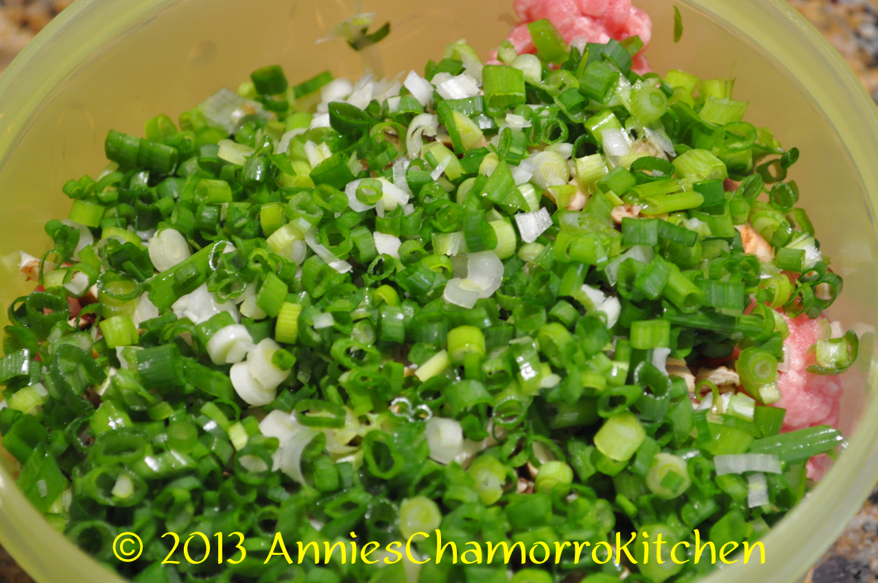 3.  Thinly slice the green onions then add them to the mixing bowl; mix together.